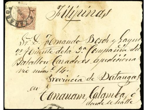 ESPAÑA. 1897. ZARAGOZA a TANAVAM, CALAMBO o dónde se halle, Provincia de Batanzas (Filipinas), 50 cts. carmín, raro sobre dirigido a un Militar Español, en Operaciones en la Isla de Luzon.
