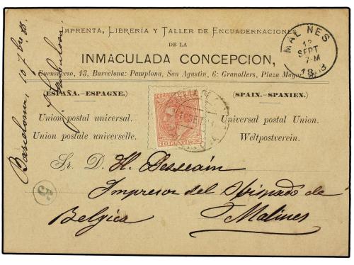 ESPAÑA. Ed. 202. 1888. Tarjeta Postal de la IMPRENTA INMACULADA CONCEPCIÓN en BARCELONA circulada a BÉLGICA con sello de 10 cts. rosa.