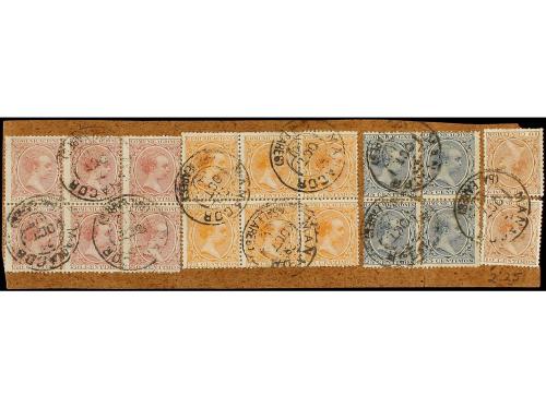 Δ ESPAÑA. Ed. 217 (2), 221 (4), 224 (6), 225 (6). 1890. Gran fragmento de Plica Judicial con franqueo de 10 cts. castaño (2), 25 cts. azul (4), 50 cts. carmín (6) y 75 cts. naranja (6). Mat. fechador tipo TRÉBOL de MANACOR/BALEARES. Espectacular y MUY RARO franqueo cuatricolor.