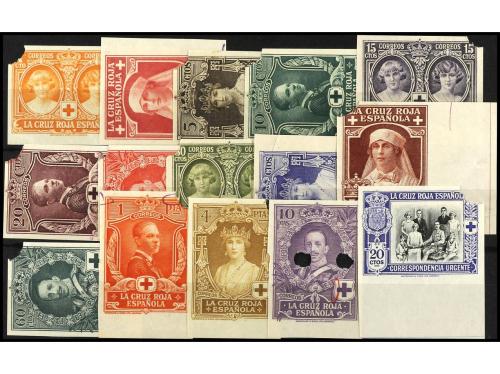 (*) ESPAÑA. Ed. 325/38aMTs. SERIE COMPLETA. CAMBIOS DE COLOR con los adoptados para las Colonias Españolas sin la habilitación, sellos sin dentar y con taladro angular, procedentes de las hojas de trabajo de la imprenta con algunas correcciones a tinta antes del tiraje definitivo, el 40 cts. algunos pliegues. CONJUNTO ESPECTACULAR, estas variedades sólo existen así con el taladro. Cat. 1.200€.