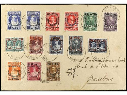 ESPAÑA. Ed. 373/87 sin 377. 1927. MADRID a BARCELONA. Serie completa sin el 55 s. s. 2 cts. azul (las pocas cartas conocidas son siempre sin este valor) en carta circulada, al dorso llegada.