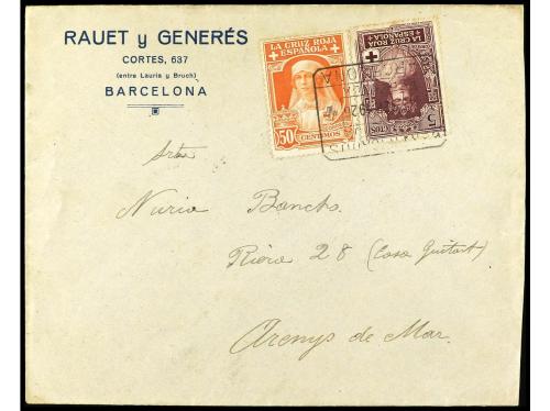 ESPAÑA. Ed. 327, 334. 1926. BARCELONA a ARENYS DE MAR. 5 cts. castaño violeta y 50 cts. naranja. Carta certificada, al dorso llegada.