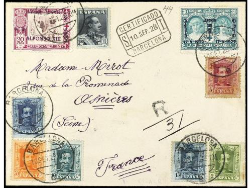 ESPAÑA. Ed. 356, 362, 311, 314/15, 319, 320/21. 1928. BARCELONA a FRANCIA. Precioso franqueo, al dorso llegada.