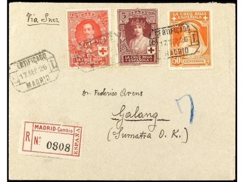 ESPAÑA. Ed. 327, 331, 334. 1926. MADRID a GALANG (Sumatra). 5 cts. castaño violeta, 25 cts. carmín y 50 cts. naranja. Carta certificada, al dorso llegada. Rara destinación.
