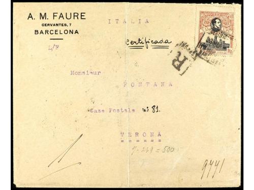 ESPAÑA. Ed. 307. 1921. BARCELONA a VERONA. 1 pta. carmín. Carta certificada, al dorso llegada. Raro franqueo.