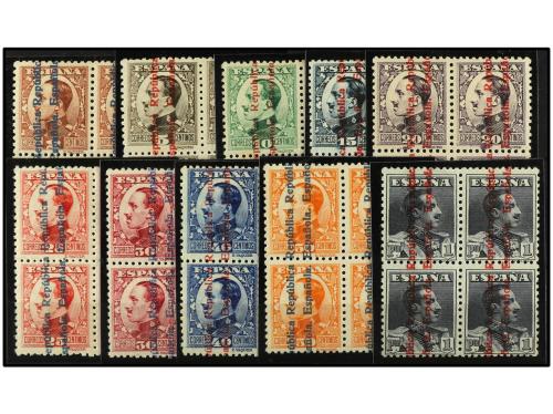 ** ESPAÑA. Ed. 593/602. SERIE COMPLETA en bloques de cuatro sin el urgente. Excelentes centrajes. LUJO. Cat. +868€.