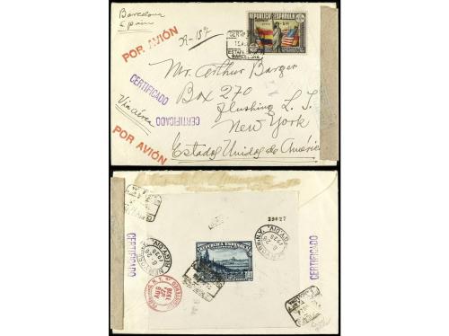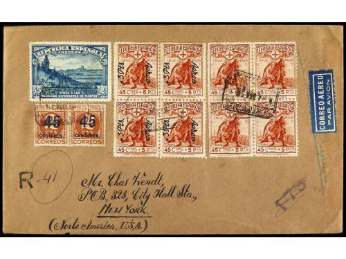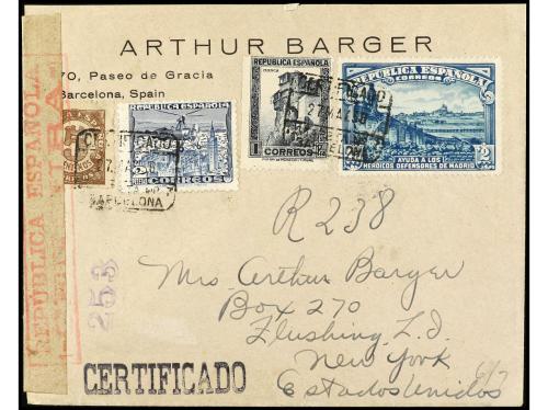 ESPAÑA. Ed. 757, 673, 745, 769. 1938. BARCELONA a NEW YORK. Carta certificada, precioso franqueo, al dorso llegada.