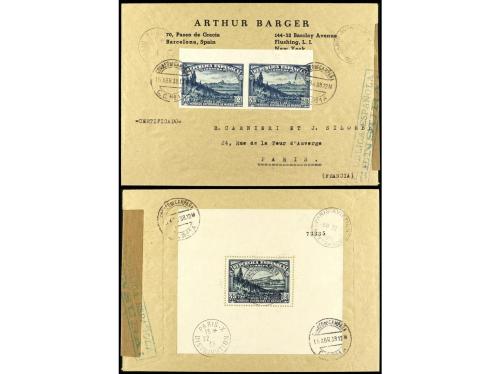 ESPAÑA. Ed. 758a, 765. 1938. BARCELONA a NEW YORK. Aéreo + 5 pts. multicolor y al dorso la HB. 45 cts. + 2 pts. en color verdoso. RARÍSIMA, sólo existen 100 HB y en carta circulada probablemente es la única. (Reproducida en la pag. 513 de la Obra de O. Schier). Carta circulada al dorso llegada.