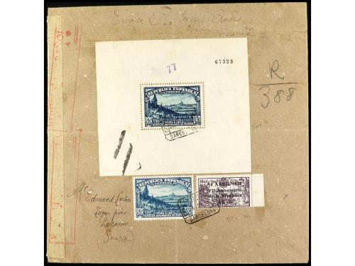 ESPAÑA. Ed. 758, 757, 755. 1938. BARCELONA a SUIZA. Sello y HB de 45 cts. + 2 pts. azul más sello de 45 cts s. 15 cts. en carta certificada, al dorso llegada.