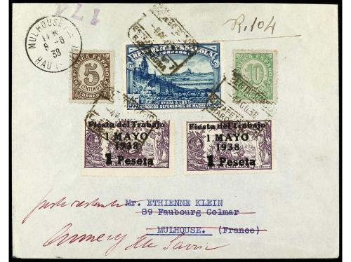 ESPAÑA. Ed. 757, 745/46, 762. 1938. BARCELONA a FRANCIA. Carta certificada, precioso franqueo, al dorso llegada.