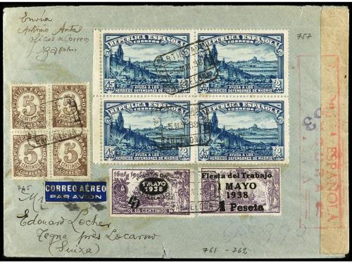 ESPAÑA. Ed. 757 (4), 745 (4), 761/62. 1938. BARCELONA a SUIZA. Carta certificada, precioso franqueo, al dorso llegada.