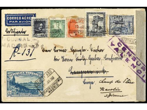 ESPAÑA. Ed. 757, 673, 682, 738, 751, 769. 1938. MADRID a SUIZA. Carta certificada, precioso franqueo, al dorso llegada.