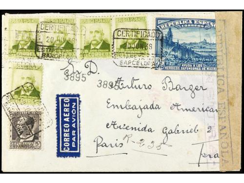 ESPAÑA. Ed. 757, 672 (5), 681. 1938. BARCELONA a PARÍS. Carta certificada. Precioso franqueo.
