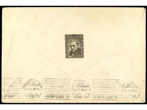 ESPAÑA. 1931. BURGOS a BILBAO. 10 cts. verde y 20 cts. lila, al dorso, impreso en calcografía, el proyecto para un sello dedicado a P. Zorrilla en color castaño (Gálvez A112). RARÍSIMO.