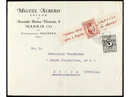 ESPAÑA. 1931 (22 mayo). MADRID a ÉCIJA (Sevilla) circulada con sellos de 25 cts. carmín y 5 cts. negro con etiqueta antimonárquica CABEZA ABAJO ANDARÁS PERO A ESPAÑA NO VOLVERÁS. Circulada recién proclamada la República en España. MUY RARA.