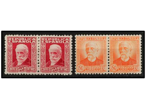 * ESPAÑA. Ed. 667 y 671 (2). 25 cts. carmín y 50 cts. naranja. Parejas, excelente centraje, sellos clave de la serie.Cat. 266.