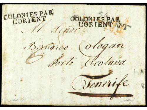 MAURICIO. 1803 (28 noviembre). ISLE DE FRANCE a TENERIFE (Islas Canarias). Carta completa con un interesante texto, fue transportada por la nave francesa "Geographe" en el retorno del viaje científico y de exploración de la cosa meridional de Australia. Marca de entrada en Francia COLONIES PAR/L'ORIENT y posteriormente circulada a las Islas Canarias. MUY INTERESANTE y RARA.
