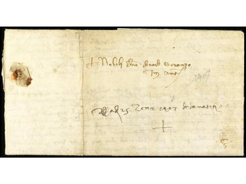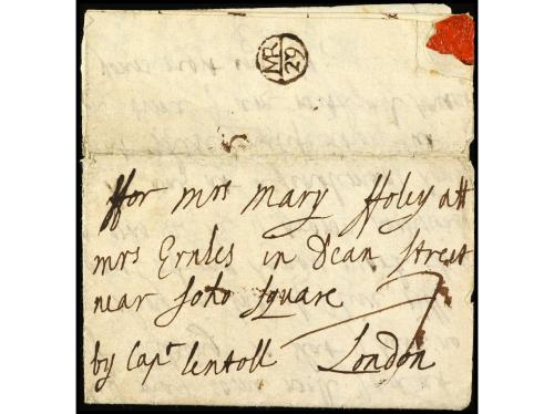 BARBADOS. (1700 ca.). Carta completa con texto sin indicación del año, porte manuscrito de "3 d" y al dorso fechador de llegada. Muy rara, una de las cartas más antiguas conocidas circuladas por el correo desde Barbados.
