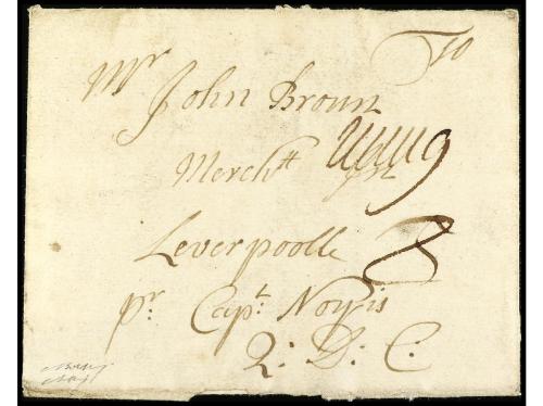 JAMAICA. 1713 (31 agosto). KINGSTON a LIVERPOOL. Carta completa con texto manuscrito "pr. Capt. Noyis" y porte manuscrito "in all 9 d.". Rara circulada en época tan temprana, al dorso llegada.