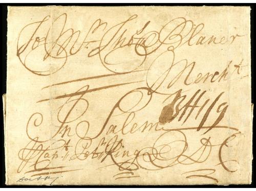 BARBADOS. 1723 (1 abril). BARBADOS a SALEM (Massachusetts). Carta completa, manuscrita "via Boston" y "pr. Capt. Peter king", porte manuscrito "B sh 1/9". RARA.