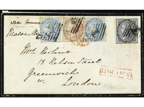 INDIA INGLESA. 1858. BOMBAY a LONDRES. 1/2 an. azul (2), 1 an. castaño y 4 an. negro.