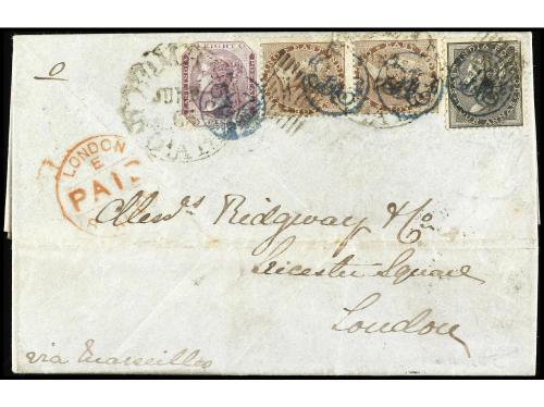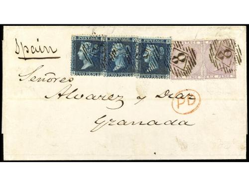 GRAN BRETAÑA. 1860. LONDON a GRANADA (España). 2 d. azul (3) y 6 d. violeta (2). MUY BONITA.