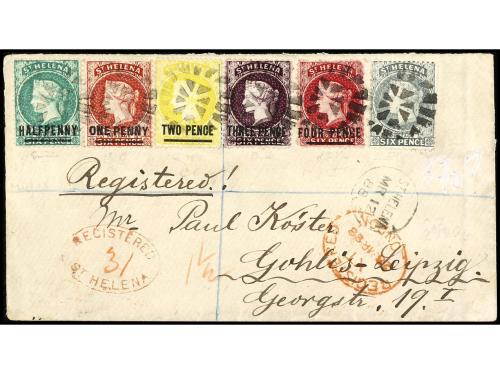 SANTA HELENA. 1888. SANTA HELENA a LEIPZIG. Carta certificada, espectacular franqueo.