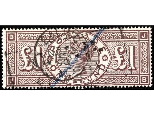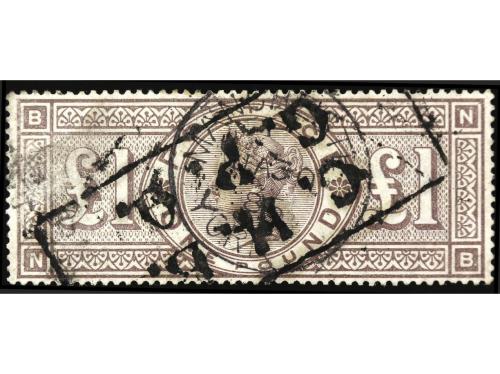 ° GRAN BRETAÑA. Yv. 89, S.G. 185. 1 £. castaño lila. Mat. fechador (cds) y raya de tinta azul (blue pencil cancel). Cat. 2.200€.