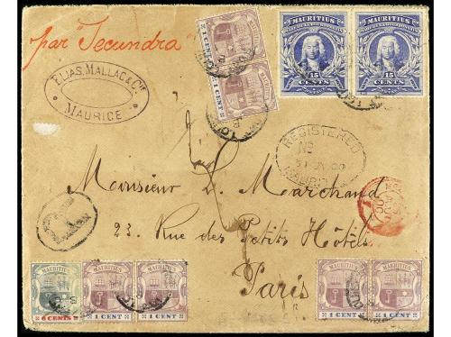 MAURICIO. 1900. MAURICE a PARÍS. Carta certificada. 1 cent. (6), 6 cents. y 15 cents. (2).