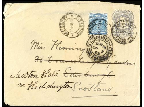 AFRICA DEL SUR. 1903. SALISBURY a GRAN BRETAÑA. Sobre entero postal de 1/2 d. gris con franqueo adicional de 1 1/2 d. azul.