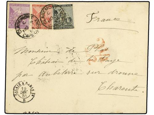 CABO DE BUENA ESPERANZA. 1884 (Nov 19). Cover to CHARENTE (France) franked by Hope 1882-86 ½d. grey, 1d. rose and 6d. mauve tied by CLAREMONT cds´s; split rate ´2½d.´ in red and CALAIS A PARIS cds of transit on front (Dec 10). A fresh and fine cover.