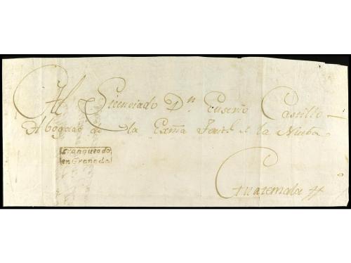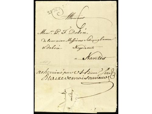 ✉ NICARAGUA. 1789. GREY TOWN (Nicaragua) a NANTES (Francia). Carta completa con texto escrita en inglés. Transportada hasta el correo francés probablemente en Martinica o Guadalupe por un encaminador (manuscrito al dorso). Marca de entrada en Francia de ST. MALO y porte de "6" décimas. RARA.