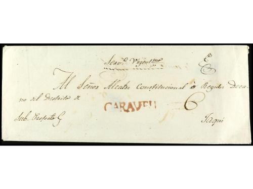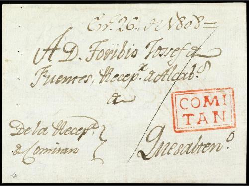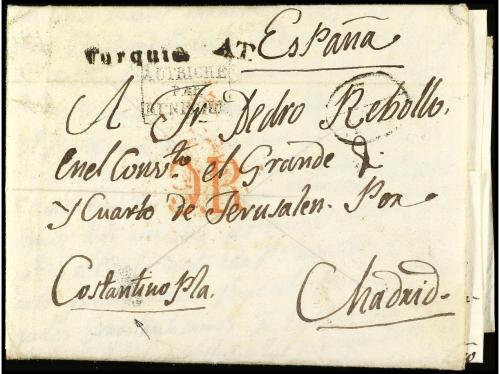 ✉ PALESTINA. 1831. HOSPICIO DE JAFFA (Palestina) a MADRID. Carta con texto enviada por el misionero Franciscano Fr. Roque Pérez a sus superiores en Madrid. En el frente encaminador manuscrito "Constantino Pla" quien la entregó al correo en Constantinopla, marcas TURQUIA y AUTRICHE/PAR/HUNINGUE, al dorso llegada y tasa en anverso de 9 reales. RARA.
