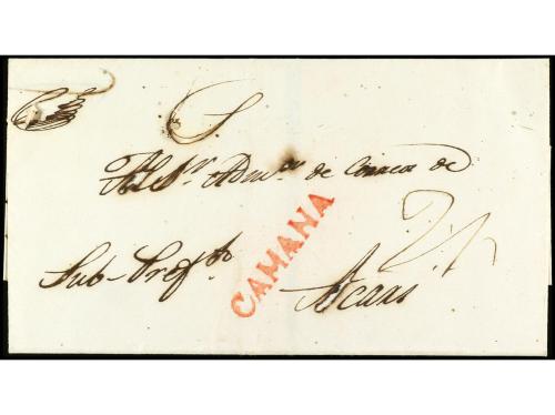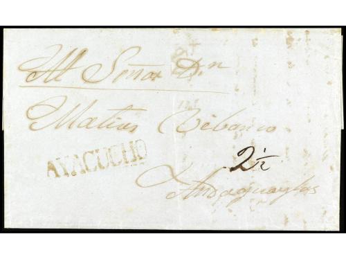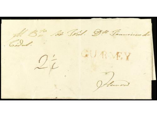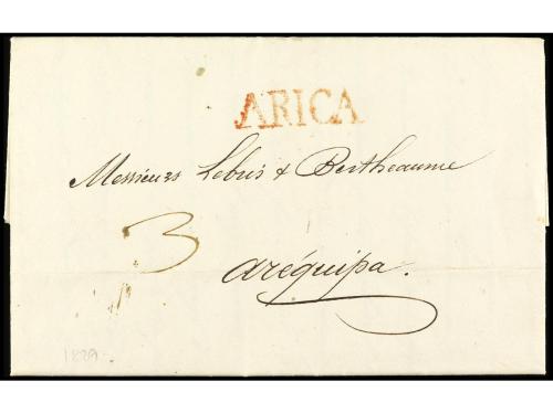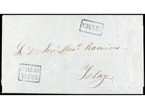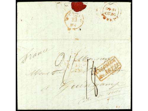 ✉ PERU. 1846 (1 de diciembre). ARICA a GUINGAMP (Francia). Porteada con 2/ (shilling) en origen y 18 décimas en destino. Marca Colonies ART 13 de intercambio FR-GB. Entregada a la agencia inglesa en este puerto en el primer año del establecimiento de BPO (el Cónsul británico fue nombrado en 16 de marzo de 1846). La presente carta demuestra que en 1846 la BPO todavía no tenía marcas, en cambio sí Panamá (23-12-1846). Una de las primeras cartas de la BPO de Arica, si no, la primera.