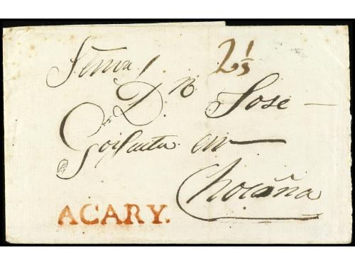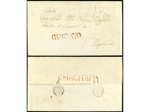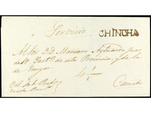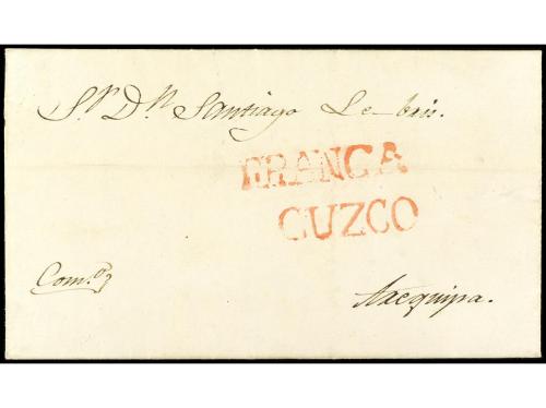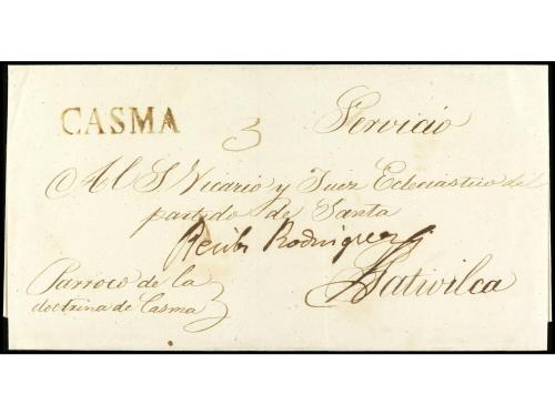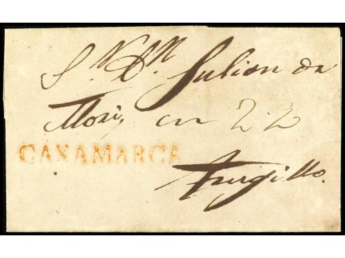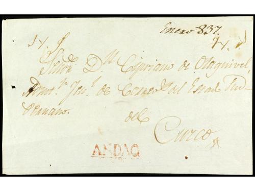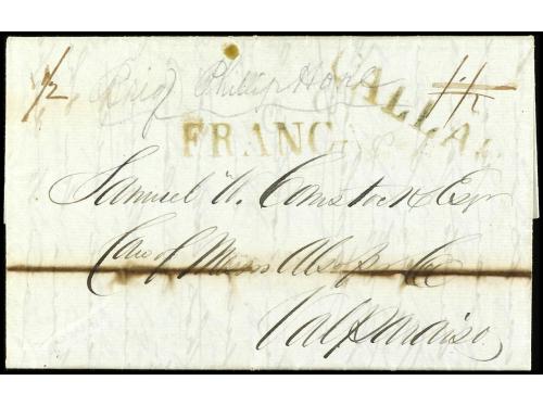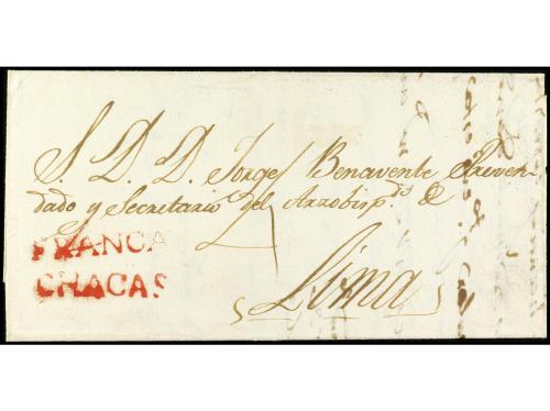 ✉ PERU. 1830 (2 enero). Carta encaminada de NUEVA YORK a LIMA. Fue puesta al correo en Callao para Valparaíso. Se estamparon las marcas CALLAO y FRANCA en tinta. En el frente "1/2" (media onza) y "1 1/2" reales, que se pagó en el puerto chileno para cartas llegadas de ultramar.