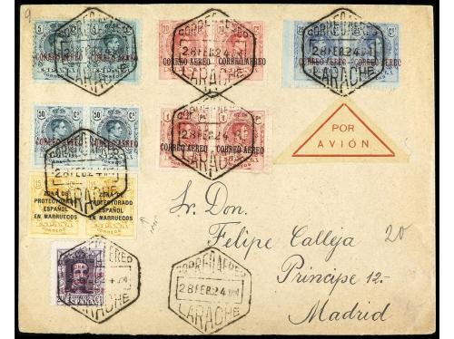 COLONIAS ESPAÑOLAS: MARRUECOS. Ed. 83, 85, 63. 1924. LARACHE a MADRID. 10 cts. verde y 20 cts. violeta mas sello de España de 5 cts. (2), 25 cts. (3) y 5 cts., 10 cts. y 50 cts. sin dentar (Ed 292/95). Precioso franqueo, al dorso llegada.