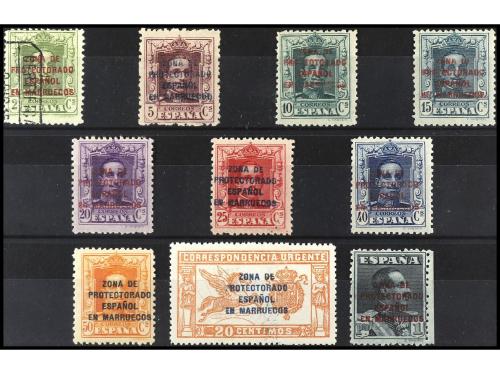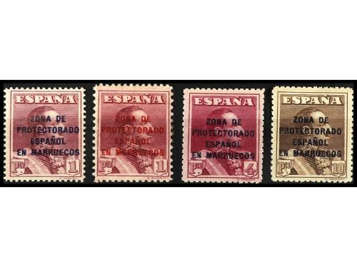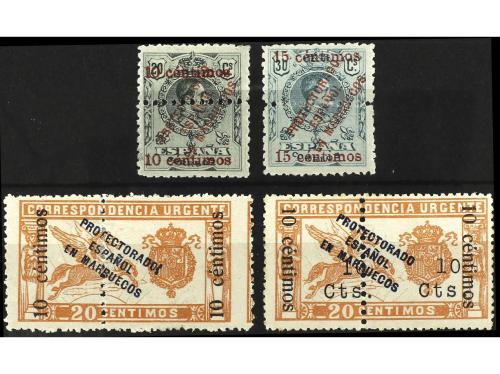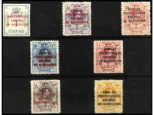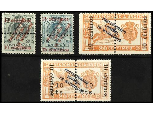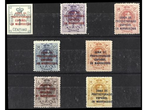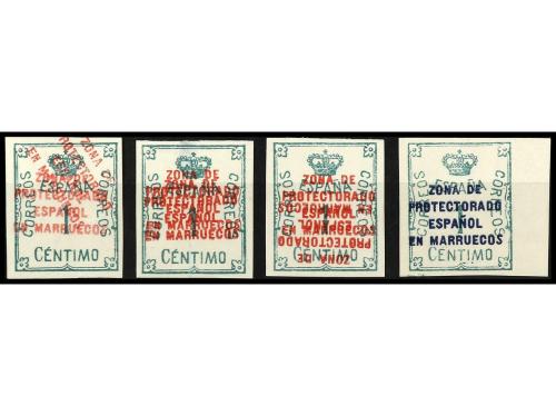 * COLONIAS ESPAÑOLAS: MARRUECOS. Ed. NE 7/10. NO EMITIDOS. 1 pta. carmín, habilitaciones en azul y rojo. 4 pts. carmín y 10 pts. castaño. PRECIOSOS. Cat. 560€.
