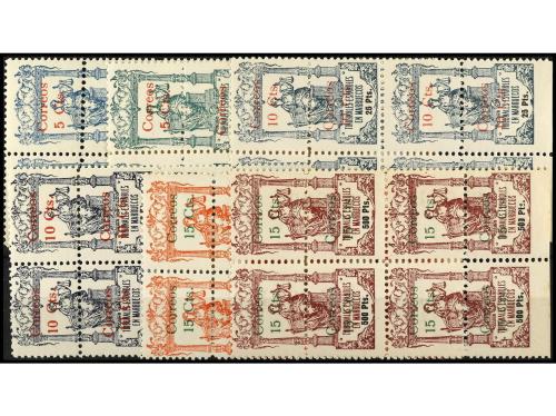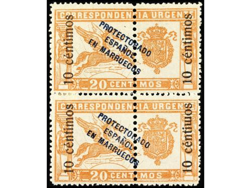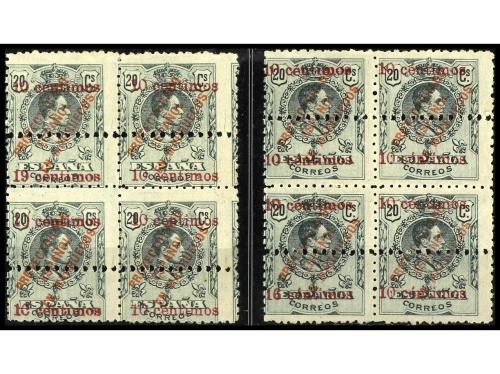 ** COLONIAS ESPAÑOLAS: MARRUECOS. Ed. 64. 10 cts. sobre 20 cts. 2 bloques de cuatro, un sello "19" en vez de "10", otro "1C" en vez de "10" y otro sello "16" en vez de 10. No reseñados.