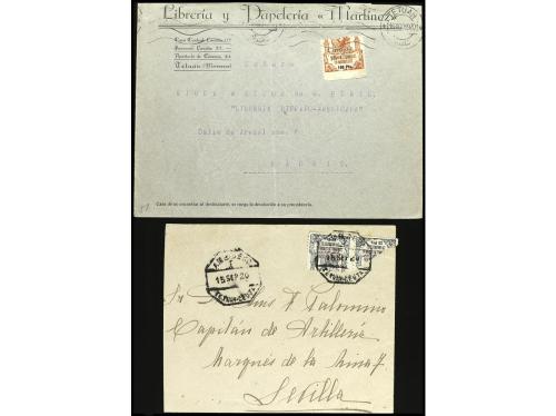 MARRUECOS. Ed. 70 y 72. 1920. Dos cartas franqueadas con mitades del sello provisional de 15 s. 100 pts. y 10 cts. s. 25 pts. más 1/4 del 10 cts. s. 25 cts. Interesante franqueo.