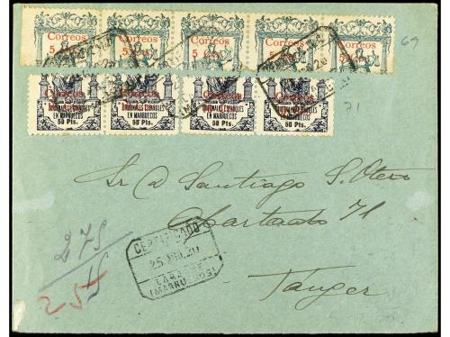 MARRUECOS. Ed. 69 (5), 71 (4). 1920. LARACHE a TÁNGER. Mitades de 5 cts. s. 10 pts. (5) y 10 cts. s. 50 pts. (4) en carta certificada. Rara combinación de franqueo.