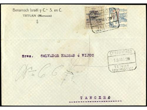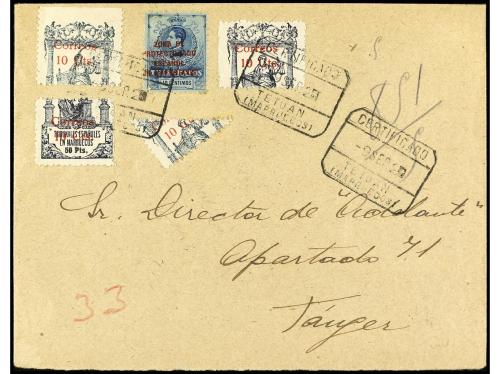 MARRUECOS. Ed. 70 (2), 71 (2). 1920. TETUÁN a TÁNGER. Mitad de los sellos provisionales de 10 cts. s. 25 pts., 10 cts. s. 50 pts. y 1/4 del sello de 10 cts. s. 25 pts. más sello de Telégrafos de 10 cts. (Ed. 10) en carta certificada. Rara combinación de franqueo.