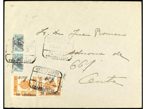 MARRUECOS. Ed. 65 (2), 66 (2). 1920. TETUÁN a CEUTA. Circulada con mitades de los sellos provisionales de 15 cts. s. 30 cts. y 10 cts. s. 20 cts.