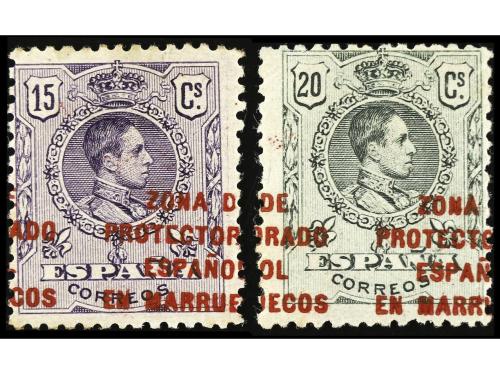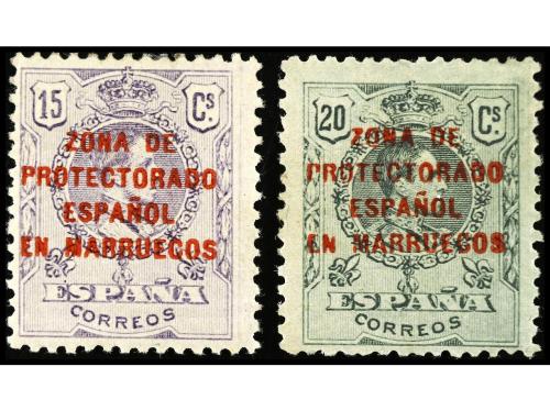 * COLONIAS ESPAÑOLAS: MARRUECOS. Ed. NE 3/4. NO EMITIDOS. SERIE COMPLETA. HABILITACIONES MUY DESPLAZADAS. PRECIOSOS, primeros ejemplares que hemos visto, sello de 20 cts. levemente adelgazado, sin importancia. Firma ROIG.