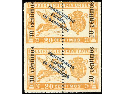 * COLONIAS ESPAÑOLAS: MARRUECOS. Ed. 66hea. 10 cts. sobre 20 cts. rojo. Pareja vertical, un sello "M" invertida. Cat. 100€.
