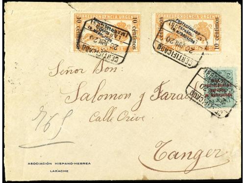 MARRUECOS. Ed. 66 (3). 1920. LARACHE a TÁNGER. Sellos provisionales de 10 cts. s. 20 cts. (2) más mitad del mismo sello en carta certificada, al dorso llegada. Rara combinación de franqueo.