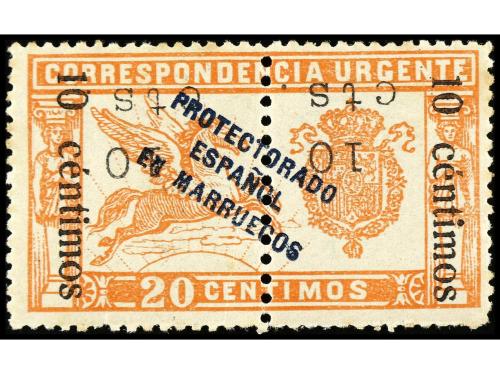 ** COLONIAS ESPAÑOLAS: MARRUECOS. Ed. 66spv. 10 cts. sobre 20 cts. rojo. Pareja vertical SIN DENTAR EN MEDIO. RARA. Cat. 195€.