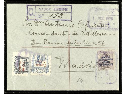 COLONIAS ESPAÑOLAS: MARRUECOS. Ed. 68, 71. 1920. NADOR a MADRID. Circulada con dos mitades de 5 cts. sobre 5 pts. azul y 10 cts. sobre 25 pts. verde, mas sello de Telégrafos de 30 cts. lila. Carta certificada, al dorso llegada.