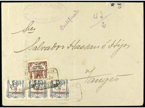 COLONIAS ESPAÑOLAS: MARRUECOS. Ed. 66hi, 66, 59. 1920. LARACHE a TÁNGER. 10 cts. sobre 20 cts. rojo (uno sorecarga invertida) y 5 cts. Al dorso llegada. RARA.