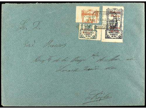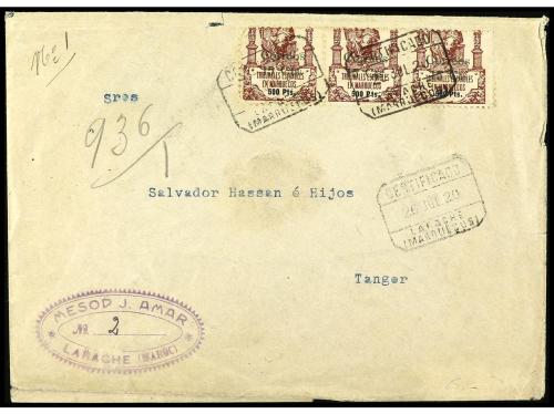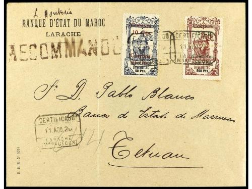 COLONIAS ESPAÑOLAS: MARRUECOS. Ed. 71, 73. 1920. LARACHE a TETUÁN. 10 cts. sobre 50 pts. azul y 15 cts. sobre 500 pts. carmín. Carta certificada, al dorso llegada, .