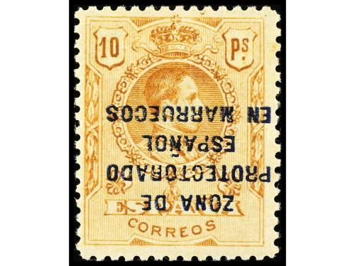 * COLONIAS ESPAÑOLAS: MARRUECOS. Ed. 80hi. 10 pts. naranja. HABILITACIÓN INVERTIDA. PRECIOSA. Firma Gálvez. Cat. 375€.